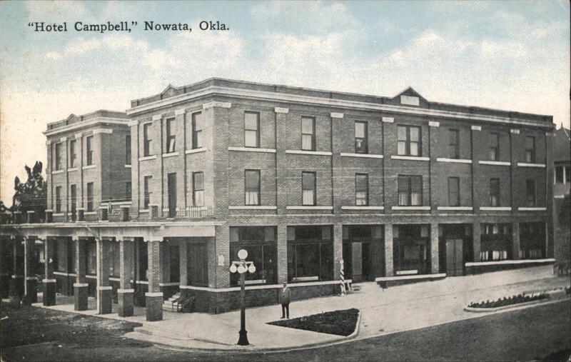 A view of the Hotel Campbell in Nowata, Oklahoma. The multi-story brick building features a covered entryway and storefronts on the ground floor. A lamppost stands on the corner, and a man in a dark suit and hat stands on the sidewalk.