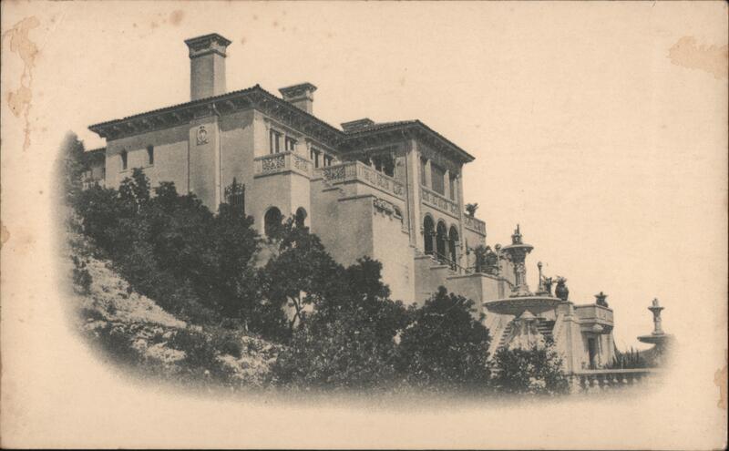 | View of Casa del Monte, showing the tiered gardens, fountain, and statues. Casa del Monte was built in 1923 for Foster Curry, son of David and Abby Curry, founders of the Mission Inn in Riverside, California. The postcard was sent to W. R. Hearst. |