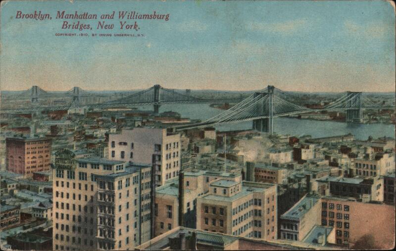 Front: Brooklyn, Manhattan and Williamsburg Bridges, New York. COPYRIGHT, 1910, BY IRVING UNDERHILL, N.Y. COSGROVED DETECTIVE 1111 111 田藥 Back: 37-M. & Co., N. Y. Twocents