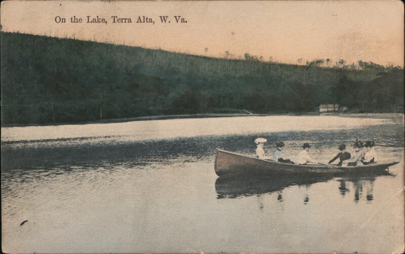 Four women in hats are seated in a rowboat on a lake. Trees line the far shore. Handwritten message on back: "Terra Alta July 27 - 10 Dear Lottie, I am safe at... running her. Velma Snowden. We will leave here but soon I hope. I fell in the only this time. I don't suppose I will be home before Sunday unless sooner. Lovingly, Oliver" |