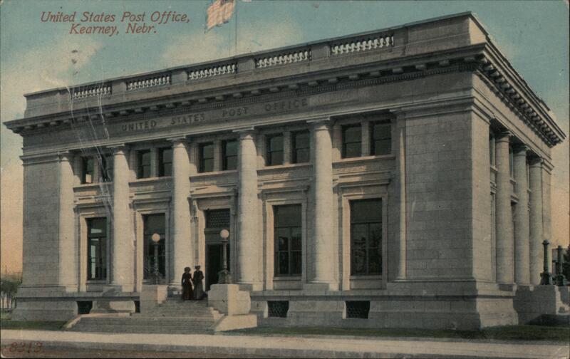 | A view of the United States Post Office in Kearney, Nebraska. Three people are standing on the steps of the building. The back is addressed to Miss Edna Barney, Madison, Nebraska and has a short message. "Arrived at Kearney at 3:15. Been here since 8:30 this morning. Expect to start for Grand Island tonight. Guided to the room & got a alright room. Lots of pretty girls here and lots of nice fellows. Guess we will have a good time." |