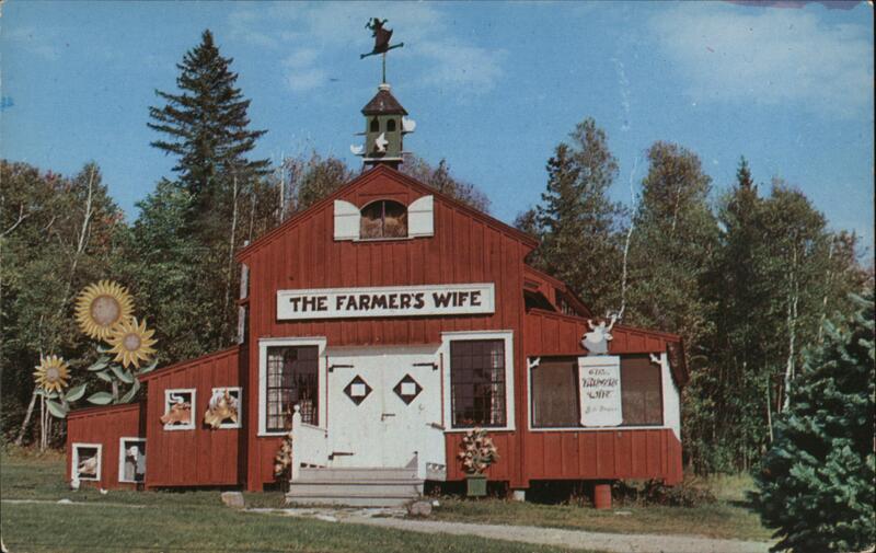 | Red barn-style building with "THE FARMER'S WIFE" painted on the front. There are whimsical decorations, including sunflowers, a weather vane with a witch, and a cutout of a dancing woman holding a sign that says "etc. the farmer's wife Mt. Blue proper" |