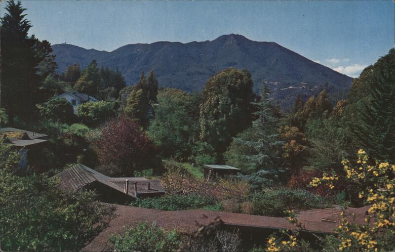 View of Mt. Tamalpais from a residential area with houses and trees in the foreground. Visible from most any spot in Marin County and the entire Bay Area. Good roads to the top. The mountain has numerous clean picnic areas. About half-way up is the Muir Woods National Monument - a virgin redwood forest. |