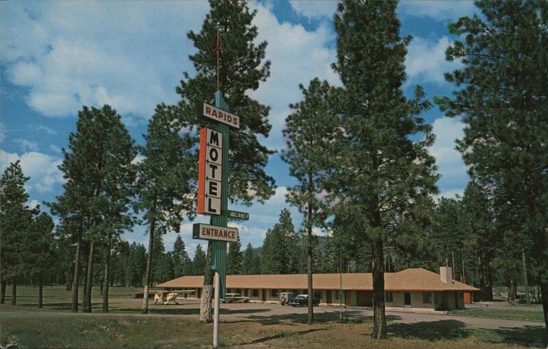 Rapids Motel sign, with a small airplane and vintage car parked in front. It's Brand New - Quiet - Finest Tile Showers - Electric Heat. Hunters and Fishermans Paradise. Cafe - Good Fishing - Service Station. 23 Miles North of Klamath Falls - South Crater Lake. Junction Highway 97. |