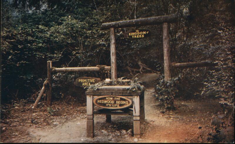 Front: PRIMITIVE AREA HOW THE REDWOOD BEGINS IT'S LIFE KINGDOM TREES Back: SC55-KINGDOM OF TREES From tiny cones grow the world's largest trees. Color KODACHROME REPRODUCTION BY MIKE ROBERTS STUDIOS BERKELEY 4 CALIFORNIA Address
