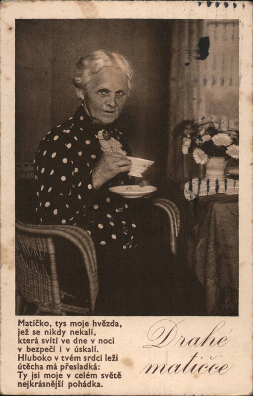 Matíčko, tys moje hvězda, jez se nikdy nekal, ktera svítí ve dne v noci v bezpečí i v úskalí. Hluboko v tvém srdci leží útěcha má přesladká: Ty jsi moje v celém světě nejkrásnější pohádka. (Translation: Mommy, you are my star, a lake that is never murky, which shines day and night in safety and in distress. Deep in your heart lies my sweetest comfort: You are my most beautiful fairy tale in the whole world.) |
