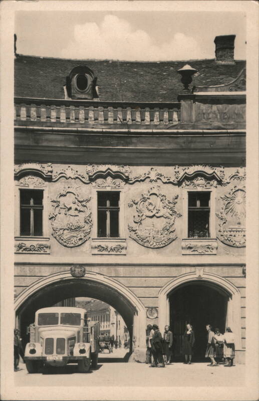 A vintage postcard view of the town gate in Spišská Nová Ves, Slovakia. A truck is parked outside the gate, and a horse-drawn cart can be seen in the background. A group of people are standing near the gate. The building above the gate has decorative panels with images and ornate window frames.