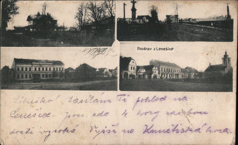 Four view postcard of Lenešice, Bohemia. Top images show the train station and a view down the tracks. Bottom images show the school and a street view with the church in the background. Handwritten message on the front reads, "Libusko! Zasílám Ti pohled na Lenešice, jaci zde k hory zachází doti vizake, vyjizí na Kunnerskou horu." |