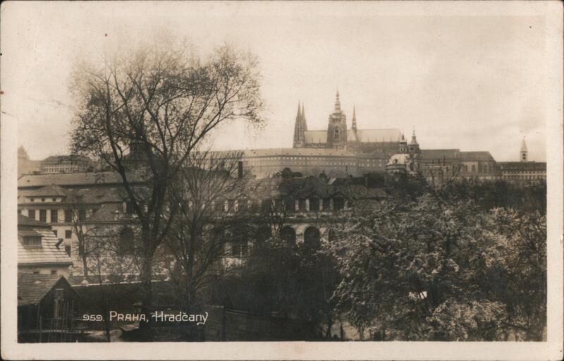 Front: 959. PRAHA, Hradčany Back: sl. Anička Ivecova Spanila Plein Chlumu p. Blatná Pozdrav a vepominku & Prahy xavila Vam i pp. rodicum Mila Hočkovn Oma Hork Shance Stor kon kors Alavo. Stočkovo. Frant. Bouck with Panda Stoūky's Alvis