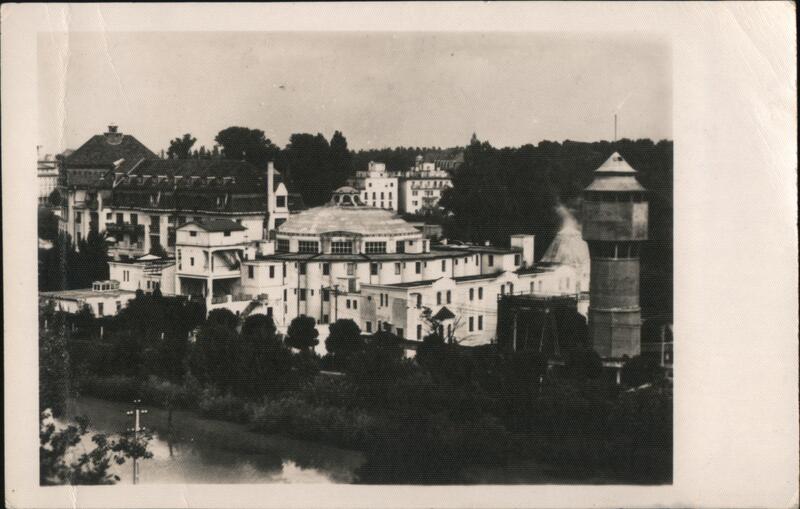 An aerial view of the Piešťany spa with the domed Irma Health Spa in the center and a water tower with smoke coming from it on the right. Trees and buildings surround the spa. A river runs in the foreground.