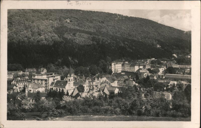 Panoramic view of Teplice, nestled in a valley and surrounded by forested hills. Buildings with varied architectural styles are visible, including a prominent church with a steeple. Trees and greenery are interspersed throughout the town. |