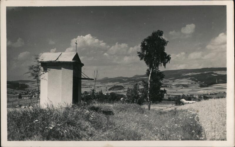 A wayside shrine stands in a field of tall grass and wildflowers. A tall birch tree is to the right. In the distance, the rolling hills and farmland of Rtyně v Podkrkonoší are visible. The back has a handwritten message and the publisher information "Nakladem V. Macha." |