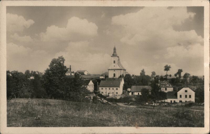 A view of the church and surrounding village of Butovice. Trees and grassy fields are visible in the foreground.