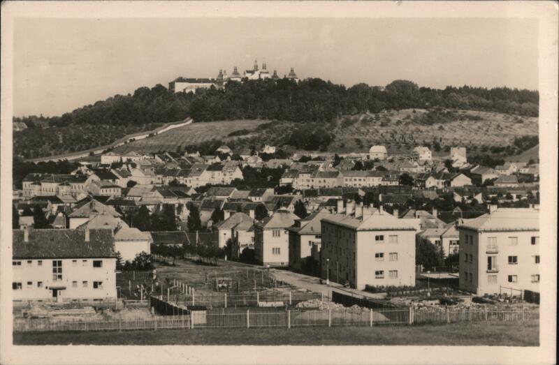 A view of the city of Příbram, with a large church or monastery visible on a hill in the background. The foreground shows a residential area with low-rise apartment buildings and single-family homes with gardens. A street runs through the center of the foreground. |
