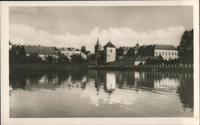 A view of Jičín, Czechoslovakia across a river. Buildings, including a church with a tall steeple, are reflected in the water.