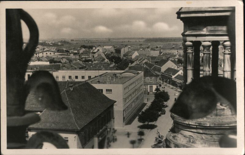 Elevated view of Hodonín, showing buildings, streets, and trees. The photograph is taken from a high vantage point, possibly a tower or church, as architectural details are visible in the foreground. The back is unused and has lines for correspondence. |