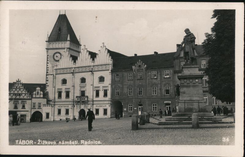 View of Tábor's Town Hall and the statue of Jan Žižka on Žižkovo náměstí (Žižka Square). The Town Hall features a distinctive clock tower and decorative facade. The statue of Jan Žižka stands prominently in the square. Several people are visible in the square. |