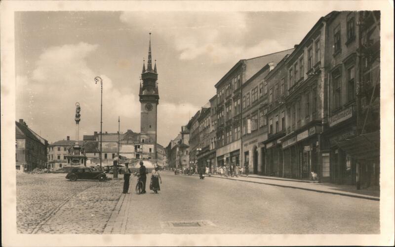 A street scene in Znojmo, Czechoslovakia, featuring the prominent town tower. A couple strolls along the sidewalk, while a man with a bicycle stands nearby. A vintage car is parked on the cobblestone street. Buildings line the street, some showing signs of damage. A statue on a tall column can be seen in the background. |