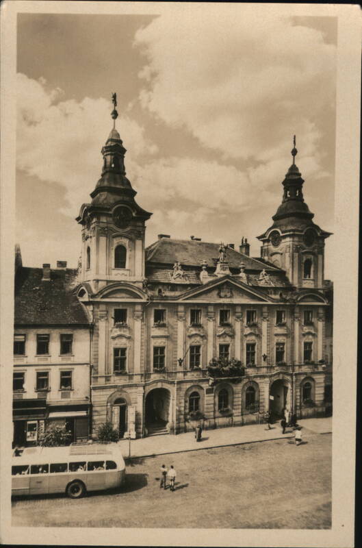 View of the Town Hall in Písek, Czechoslovakia. A bus and some pedestrians are visible in the square in front of the building.