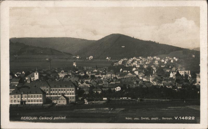 Front: المجال BEROUN: Celkový pohled. Nákl. Jos. Šmidt, papír., Beroun. V.14822 Back: Радости рича ČESKOSLOVENSKO BERCU 30 VI, 30-4 Pan Histrator 50 50 HALLŘŮ 50 Foguer obchadrak Florice Podkrkonos Husova to 10- 302 PAH