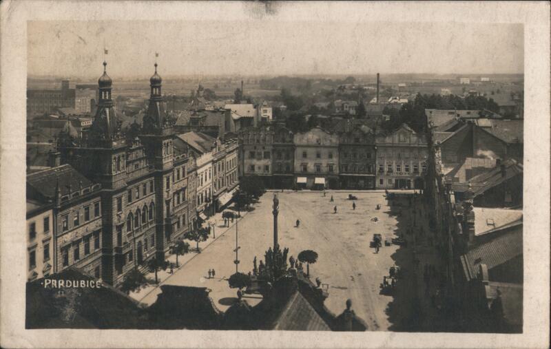 An aerial view of the town square in Pardubice, Czechoslovakia. The square is paved and surrounded by buildings. A monument stands in the center of the square. People and vehicles can be seen in the square. Buildings with towers and flags can be seen on the left side of the image. The surrounding area is visible in the background. |