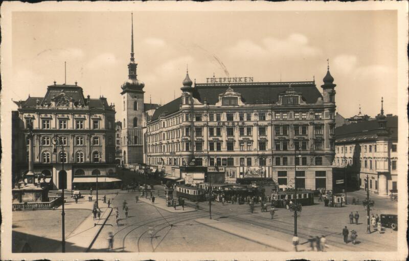| View of the Telefunken building and Freedom Square in Brno, Czechoslovakia. Streetcars and pedestrians are visible. The building has elaborate domes and decorative facade details. A tall spire is visible behind the Telefunken building. |