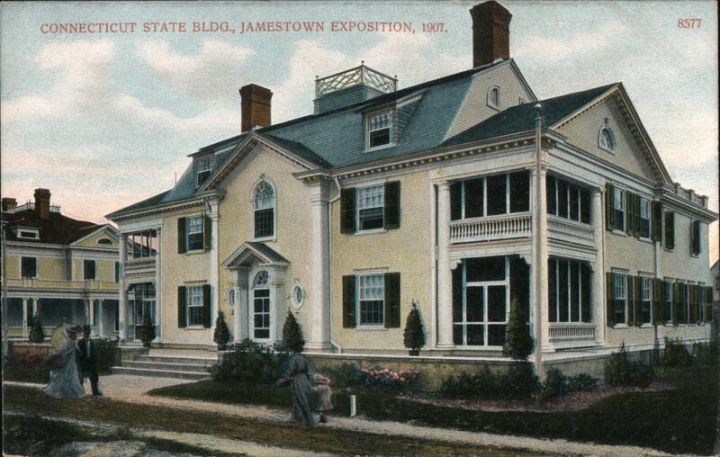 Front: CONNECTICUT STATE BLDG., JAMESTOWN EXPOSITION, 1907. 8577 Back: Made in Germany, A. C. Bosselman & Co., New York. Dost Card. One Cent for United States, and Island Possessions, Cuba, Canada and For Foreign.