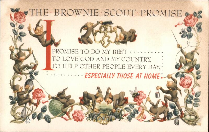 Vintage postcard featuring Brownie Scouts depicted as elves engaged in various activities, surrounding the text of the Brownie Scout Promise: "I promise to do my best to love God and my country, to help other people every day, especially those at home." |
