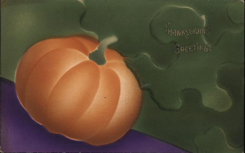 An orange pumpkin sits on a purple surface against a green background. The words "Thanksgiving Greetings" appear in gold script in the upper right corner.