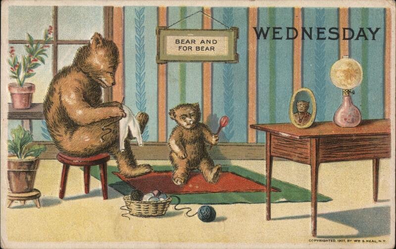 | Inside a room with blue and pink striped wallpaper, Mama Bear sits on a wooden stool upon a red rug, sewing a white garment. Baby Bear sits on the rug holding a pink rattle. A basket of yarn sits beside Baby Bear. A framed photo of a cat sits on a small table with an oil lamp. A sign on the wall reads "BEAR AND FOR BEAR". |
