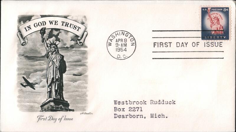 Statue of Liberty with airplane and banner: "In God We Trust"