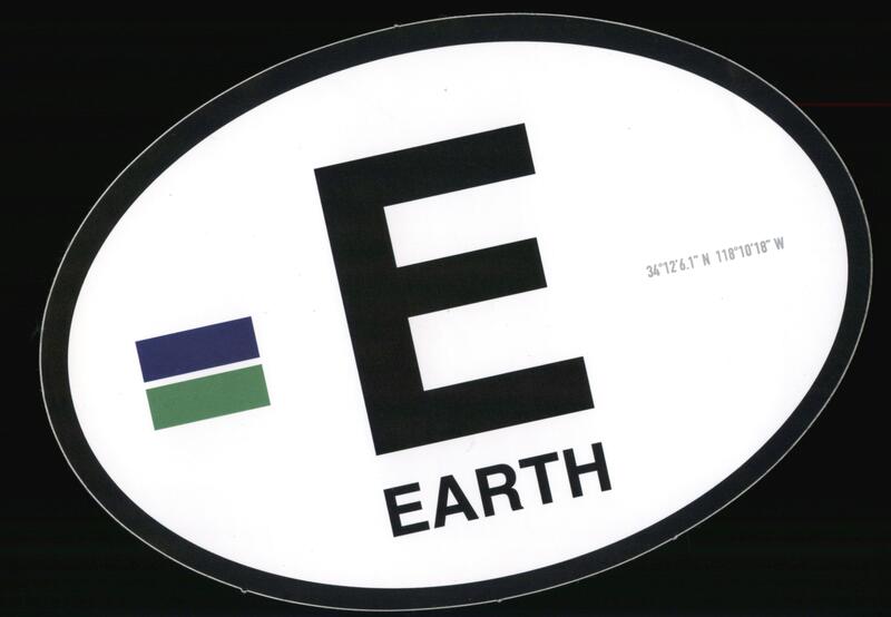 | A bumper sticker with a large black letter "E", a small horizontal blue and green rectangle, the word "EARTH", and the coordinates 34°17'26"N 118°10'18"W. The back of the sticker reads: "GALACTIC TRAVEL BUMPER STICKER Show pride in your home planet! Centuries ago, terrestrial travelers indicated their place of origin by adhering a sticker on their rear collision unit. As you journey the galaxy, you can continue this tradition and show pride in Mothership Earth. Guaranteed against cosmic radiation and micrometeoroid impact." |