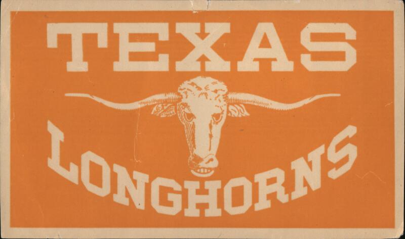 Orange postcard featuring the Texas Longhorns logo with the word "TEXAS" above a longhorn head and the word "LONGHORNS" below it.