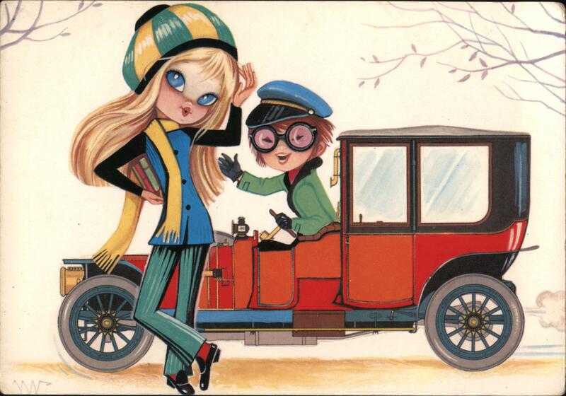 | A young woman with long blonde hair, wearing a green and yellow hat, blue jacket, and green and blue striped pants, stands next to an antique red car. A young man with glasses and a blue cap is seated in the driver's seat. The background features bare trees. |