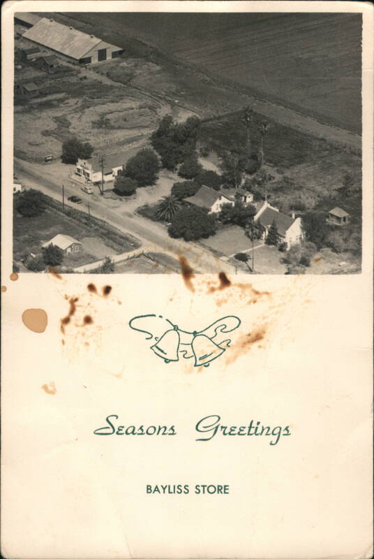 An aerial view of the Bayliss Store, adjacent buildings, and surrounding area. A windmill and other farm buildings are visible in the background.