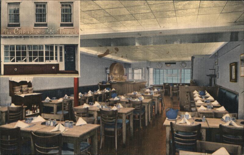 Interior view of The Captain's Table restaurant, showing tables, chairs, and a counter area. An inset image shows the exterior of the building with a sign reading "The Captain's Table". The back of the card indicates the restaurant is air conditioned and located at 410 Sixth Ave, New York, N. Y., with the phone number Algonquin 4-6825. It also states, "Where every table is the Captain's Table and the fare is the Captain's Fare." |