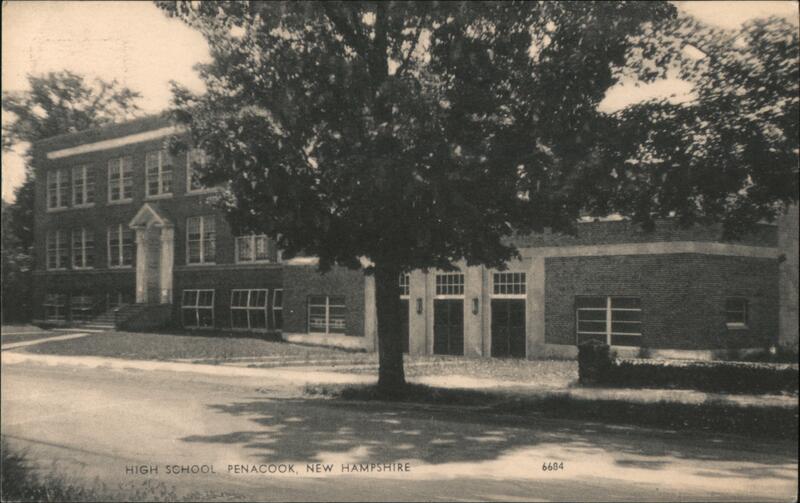 A view of Penacook High School in Penacook, New Hampshire. The school is a two-story brick building with large windows. A large tree stands in front of the school, partially obscuring the view of a smaller, attached building to the right. A paved road runs in front of the school. |