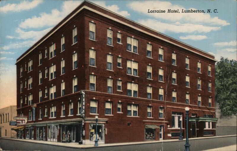 | View of the Loraine Hotel, a five-story brick building. Several businesses occupy the ground floor. "Wonderful riding. Buick is "super" alright. Sandwiches were delicious. Best 400 miles between ... chilly. Weather is great. More later. Love to all - Joy Bug. Stayed at very swank motel across road. R.M." |