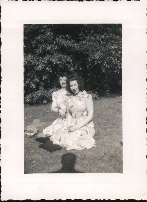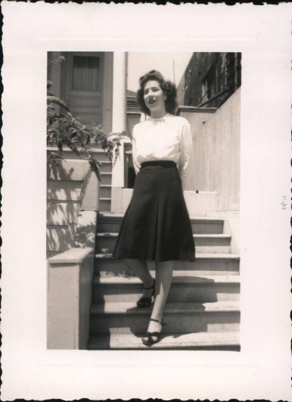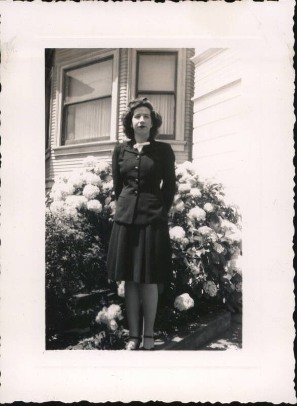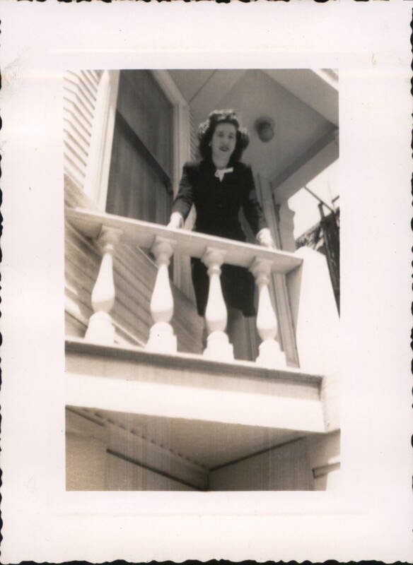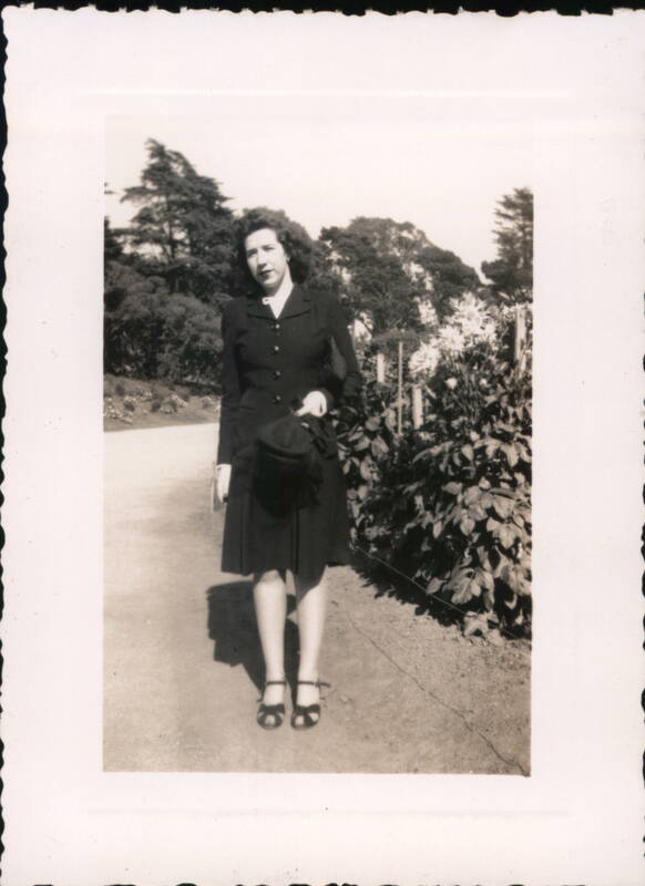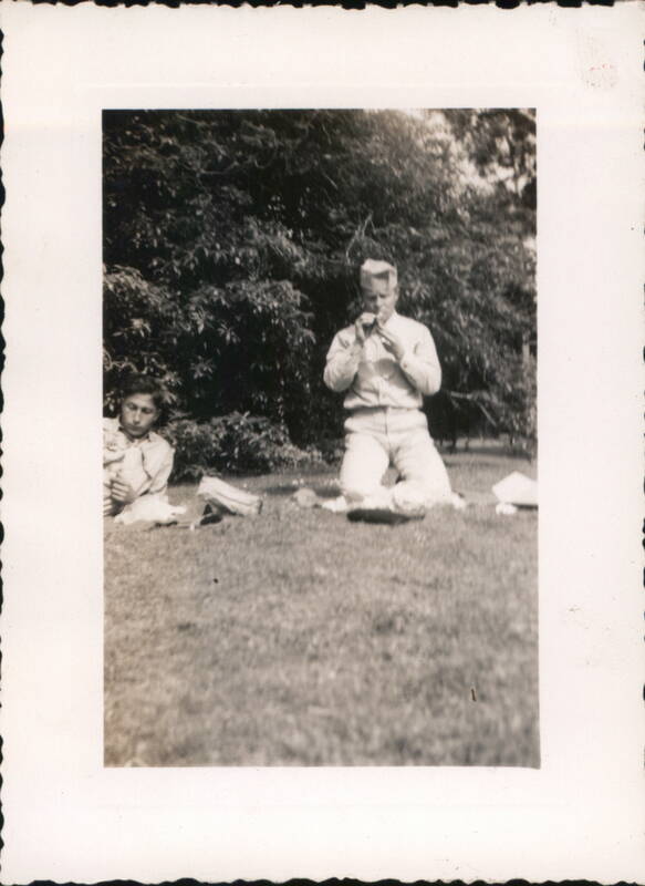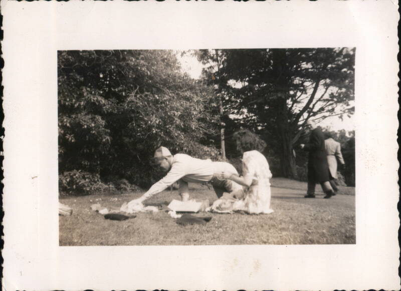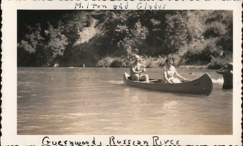 | A collection of vintage photographs featuring various scenes: people relaxing and picnicking in a park, canoeing on "Guernsey's Russian River," a log structure at "Redwood Empire Fair," a seal, and a woman posing in different locations, including a porch and stairs. |
