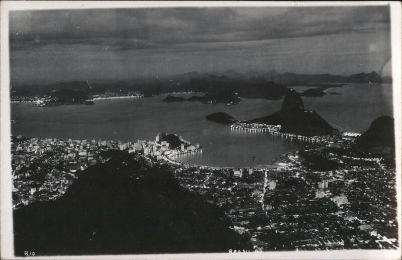 A night view of Rio de Janeiro, Brazil, showing the city lights and Sugarloaf Mountain.