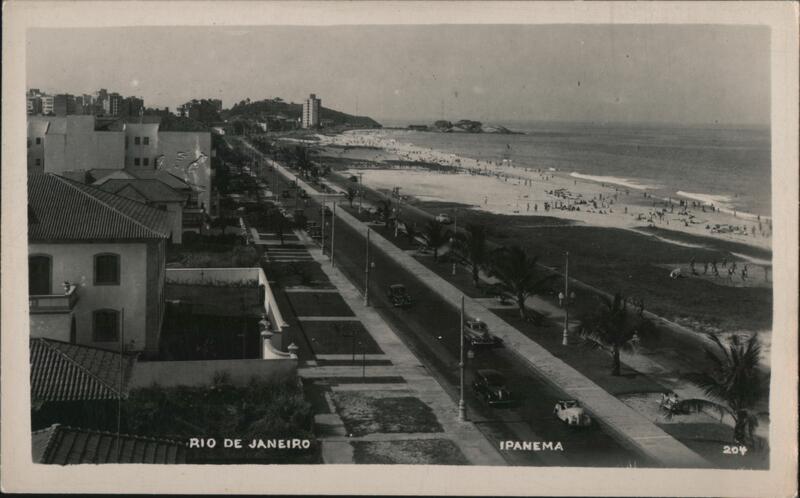 A view of Ipanema Beach in Rio de Janeiro. The beach is lined with buildings and palm trees. Cars are parked along the road next to the beach. People are enjoying the beach and the water.