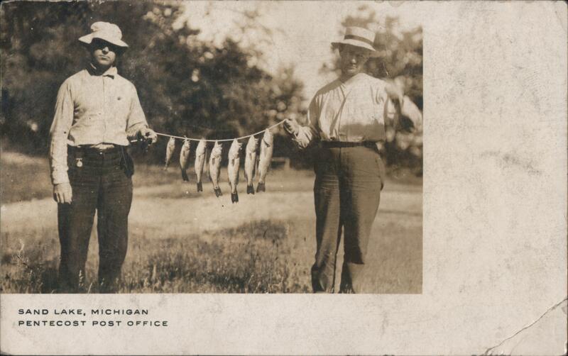 A man and a woman, both wearing hats, stand holding a string of fish. The man is wearing a bucket hat and the woman is wearing a straw hat. "If I make good connection I'll be able to see you about 8:00 P.M. otherwise will not get in until 10:30. Bitter than last week." |