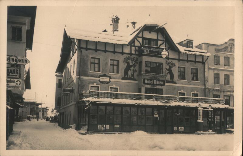 | Winter view of the Hotel Baren in St. Johann in Tirol, Austria. The hotel has a large glassed-in patio area in front. Two bears are painted on the front of the building between the second and third story windows. Snow covers the street and patio area. Signs for Min-Benzin and a Bank are visible to the left. |