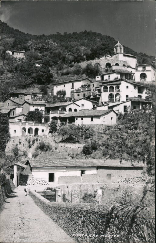 A view of a hillside village with white stucco buildings, red tile roofs, and arched porches. A church with a bell tower is visible at the top of the hill. A dirt road leads into the foreground, bordered by a low wall and some vegetation.