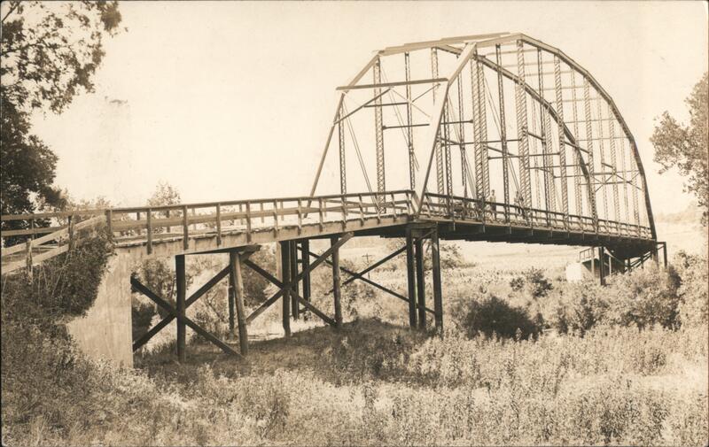 A wooden and metal bridge spans a creek. Trees and vegetation are visible in the foreground and background.
