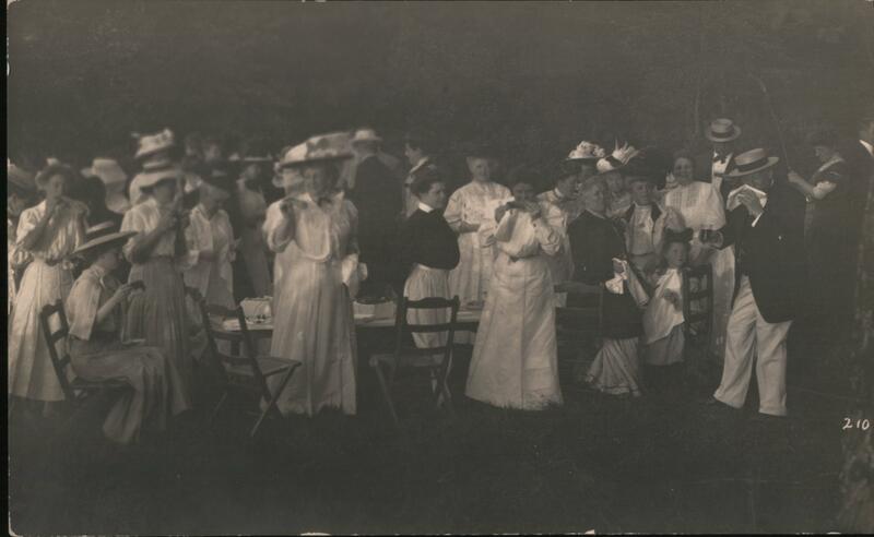 A group of people, dressed in formal attire, are gathered outdoors. Some are holding what appear to be drinks or glasses. Tables and chairs are visible in the background.