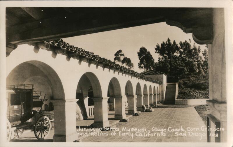 Front: DIEGO JULIAN FRARY & FOST Junipero Serra Museum, Stage Coach, Corn Grinders and Relies of Early California-San Diego es Back: Edua- fou 12-55 DEVOLITE PEERLESS ADDRESS