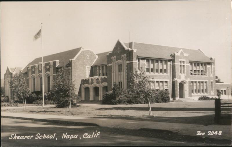 A view of Shearer School in Napa, California. An American flag flies in front of the school.