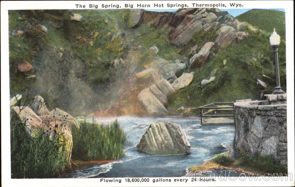Flowing 18,600,000 gallons every 24 hours. From this Big Spring come the waters of the Big Horn Hot Springs, which are so well known for their curative and medicinal properties, as well as their scenic beauty.