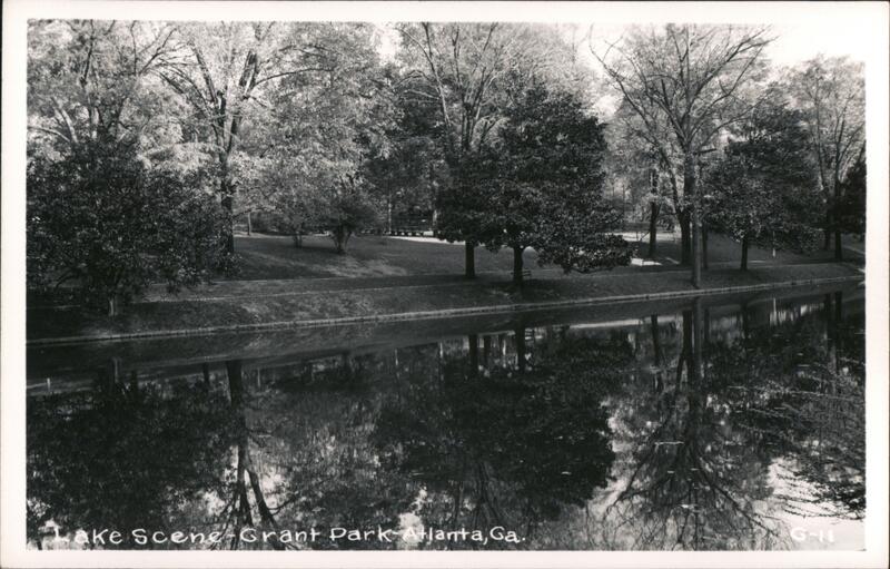 A view of a lake at Grant Park in Atlanta, Georgia. Trees line the shore of the lake, and their reflections are visible in the water.